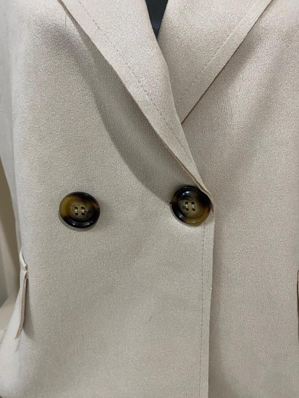 Chaqueta de antelina en color beiges sin mangas, cruzada y con botón interior e exterior. De talla única.