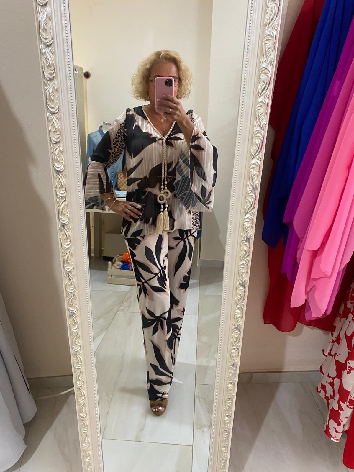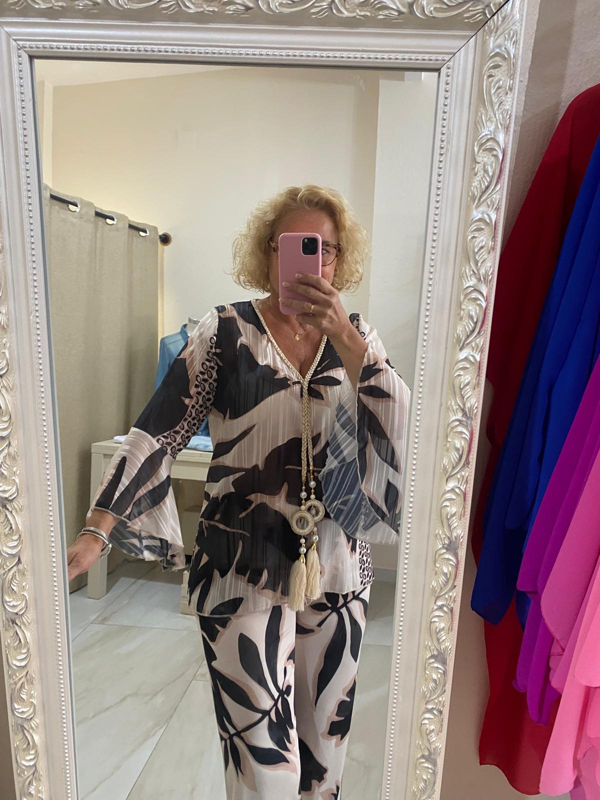 Conjunto de pantalón en punto de seda y blusa en  tejido de gasa. Talla única que da desde la talla 38 hasta la talla 44.