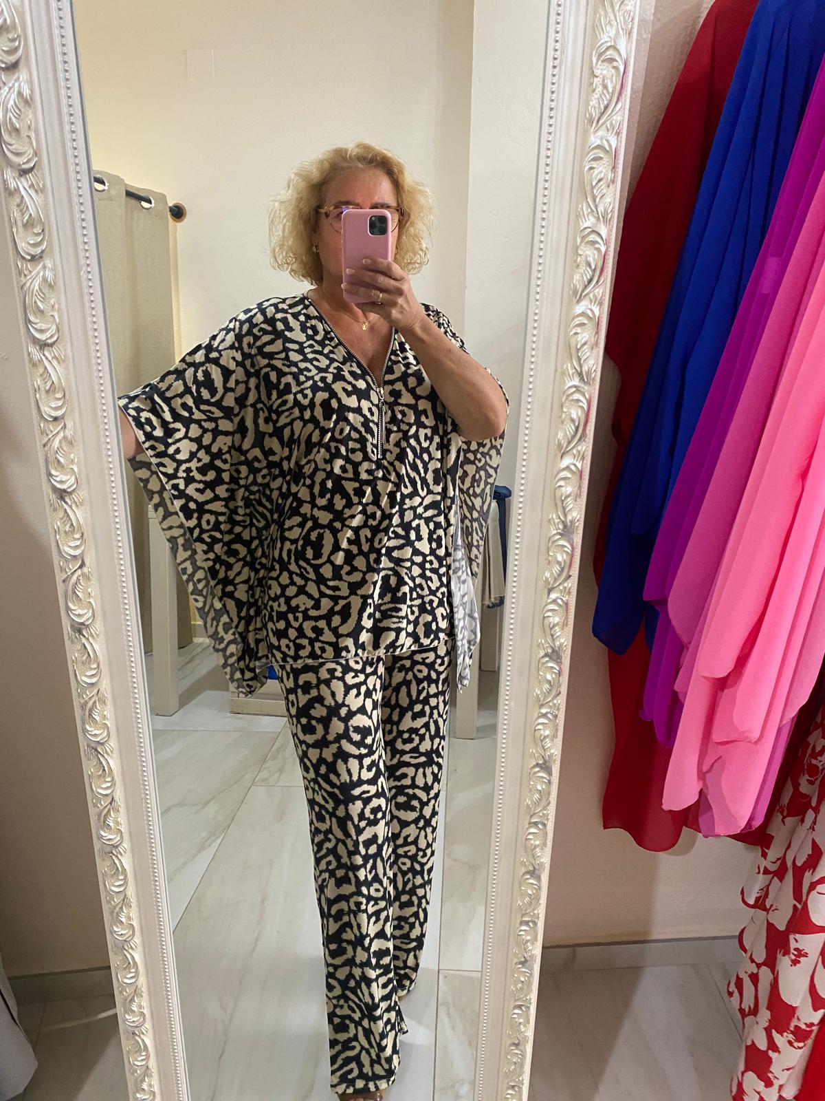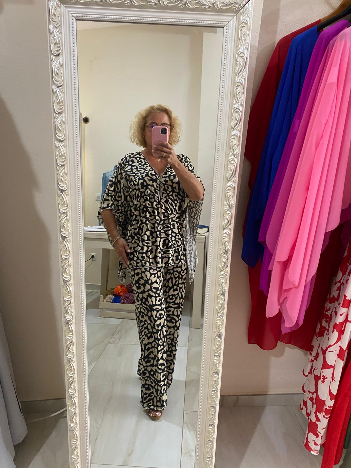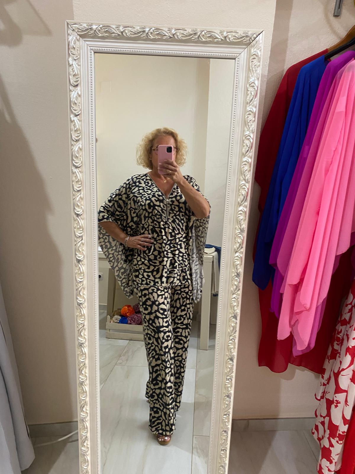 Conjunto de pantalón y blusón de punto de seda. Talla única que da desde la talla 40 hasta la talla 48.