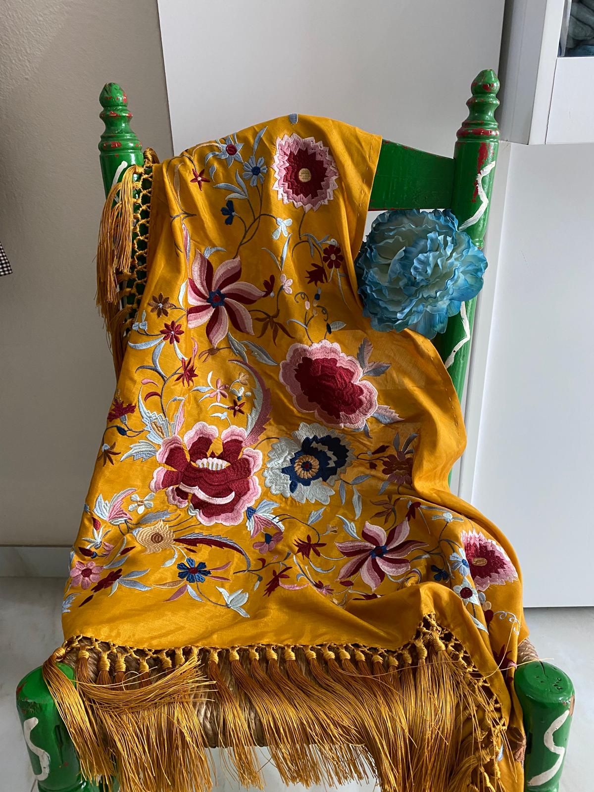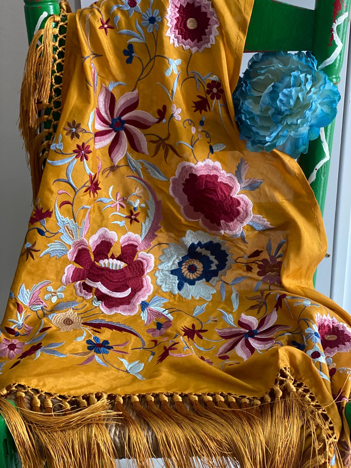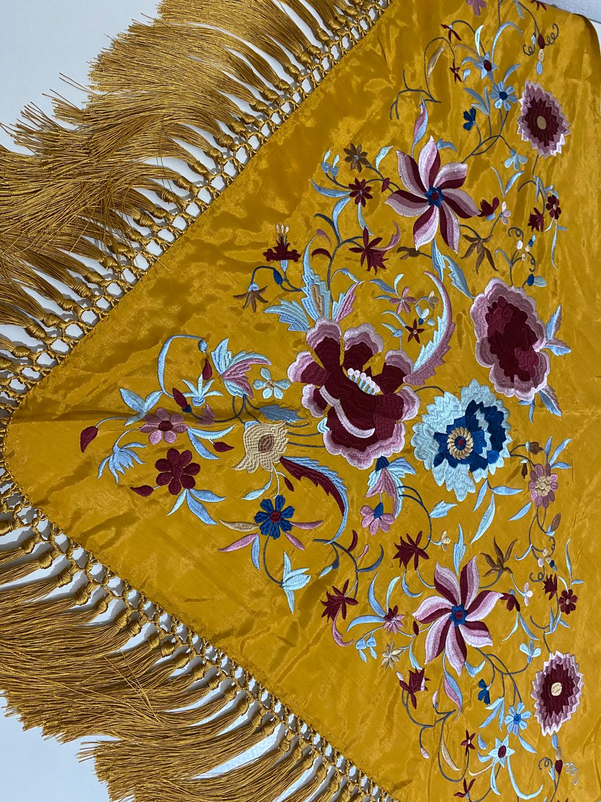 Mantoncillo de seda mostaza, bordado en seda y flecado a mano con seda valenciana.