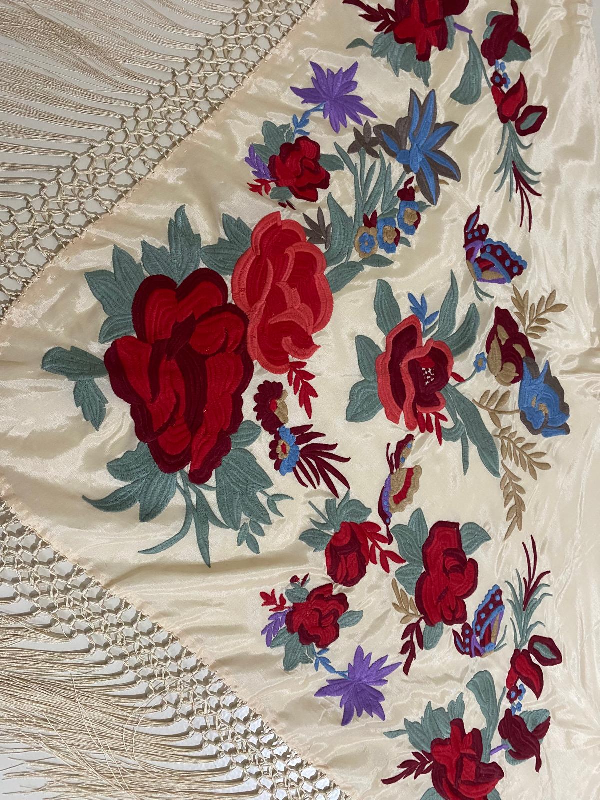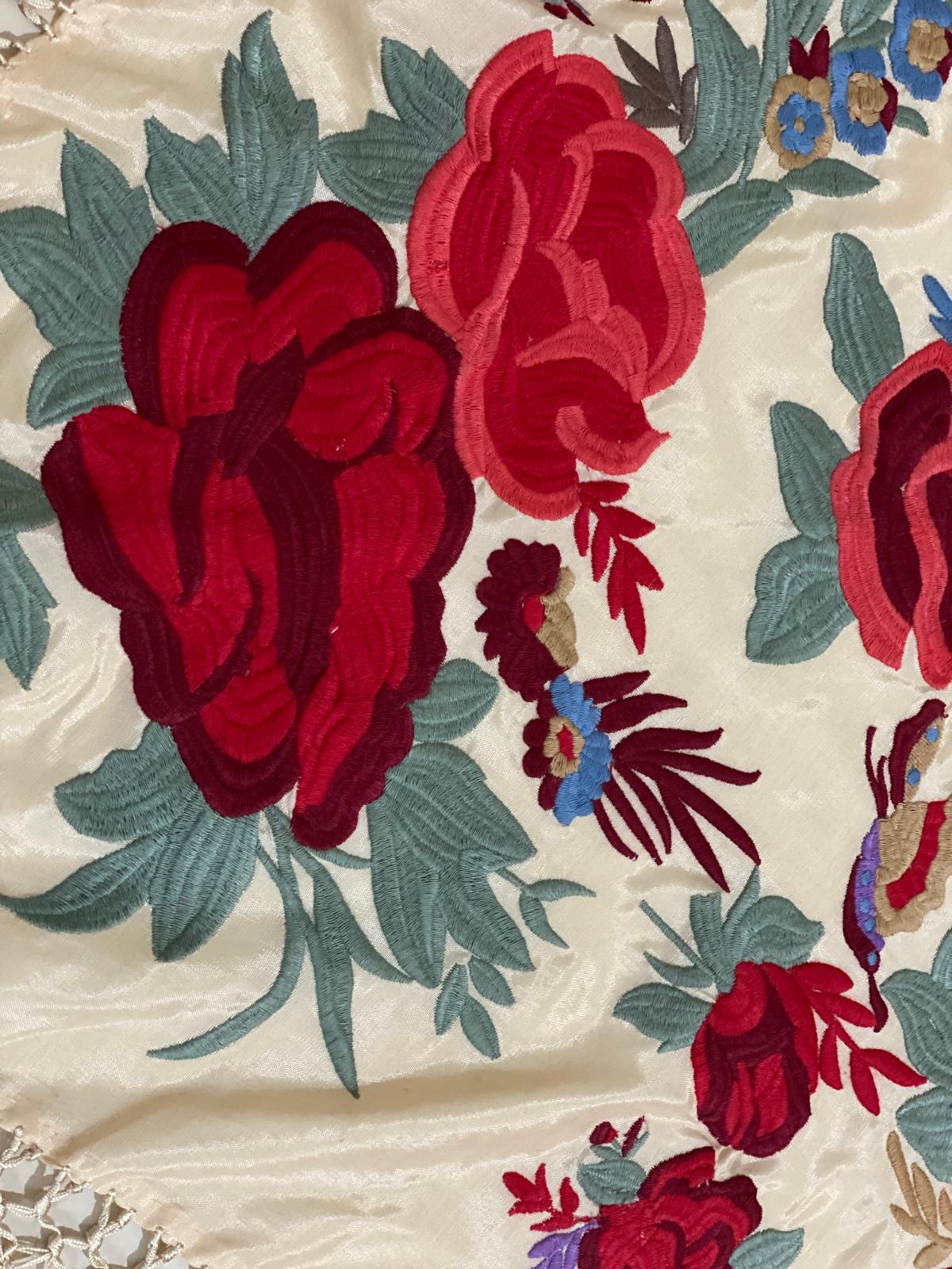 Matoncillo de seda beiges, bordado en algodón rojo y flecado a mano con seda valenciana.