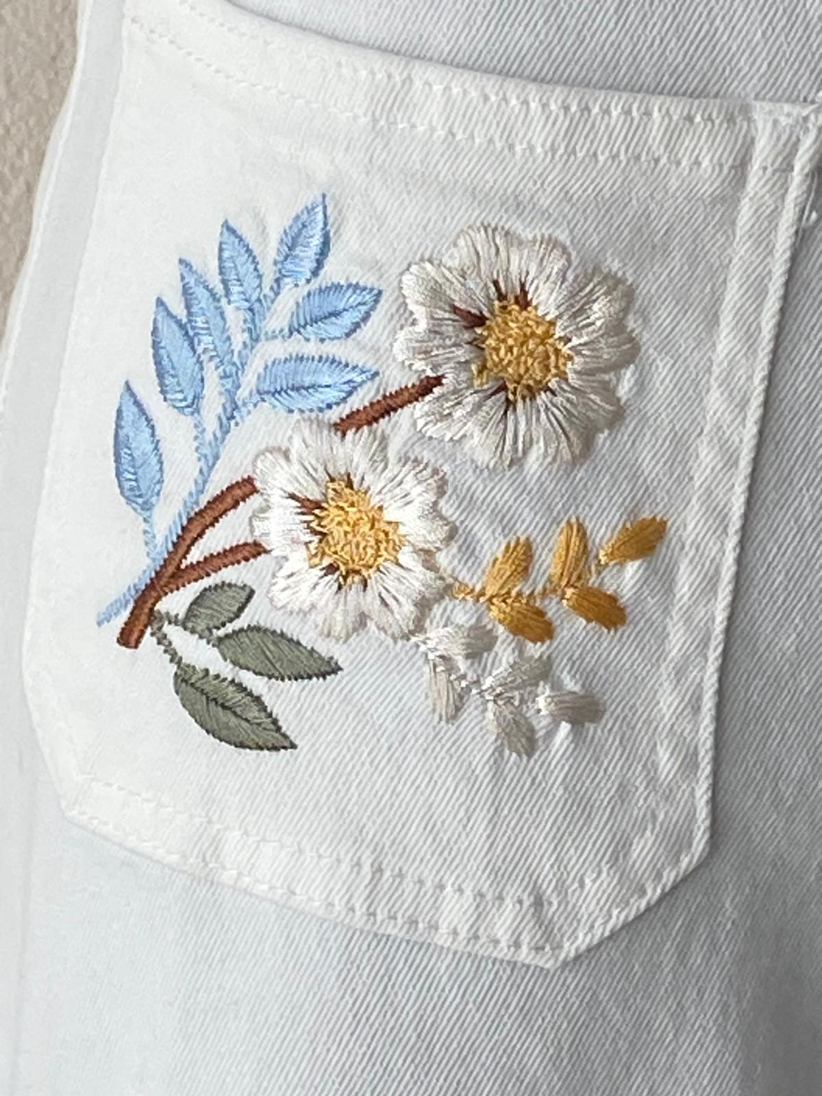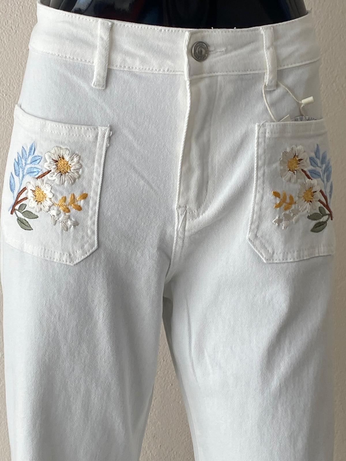 Pantalón blanco vaquero con flores bordadas en bolsillos delantero. Talla 42.