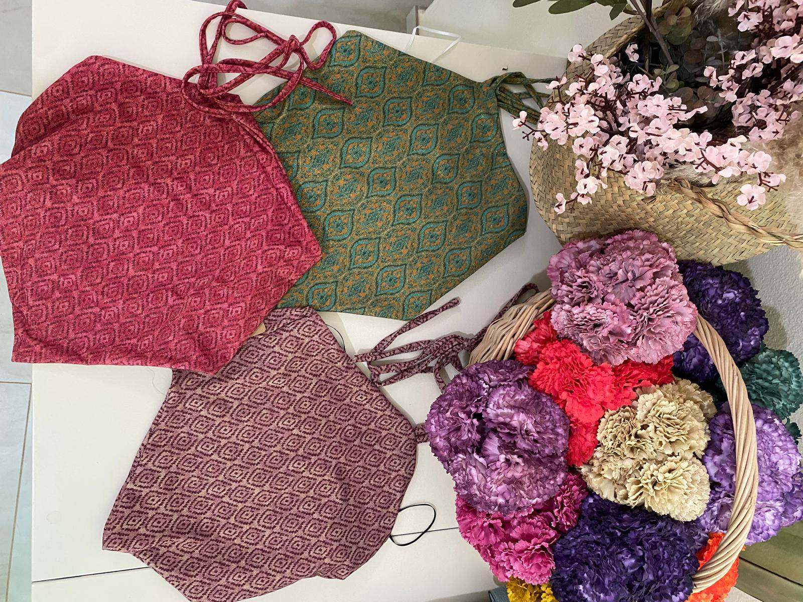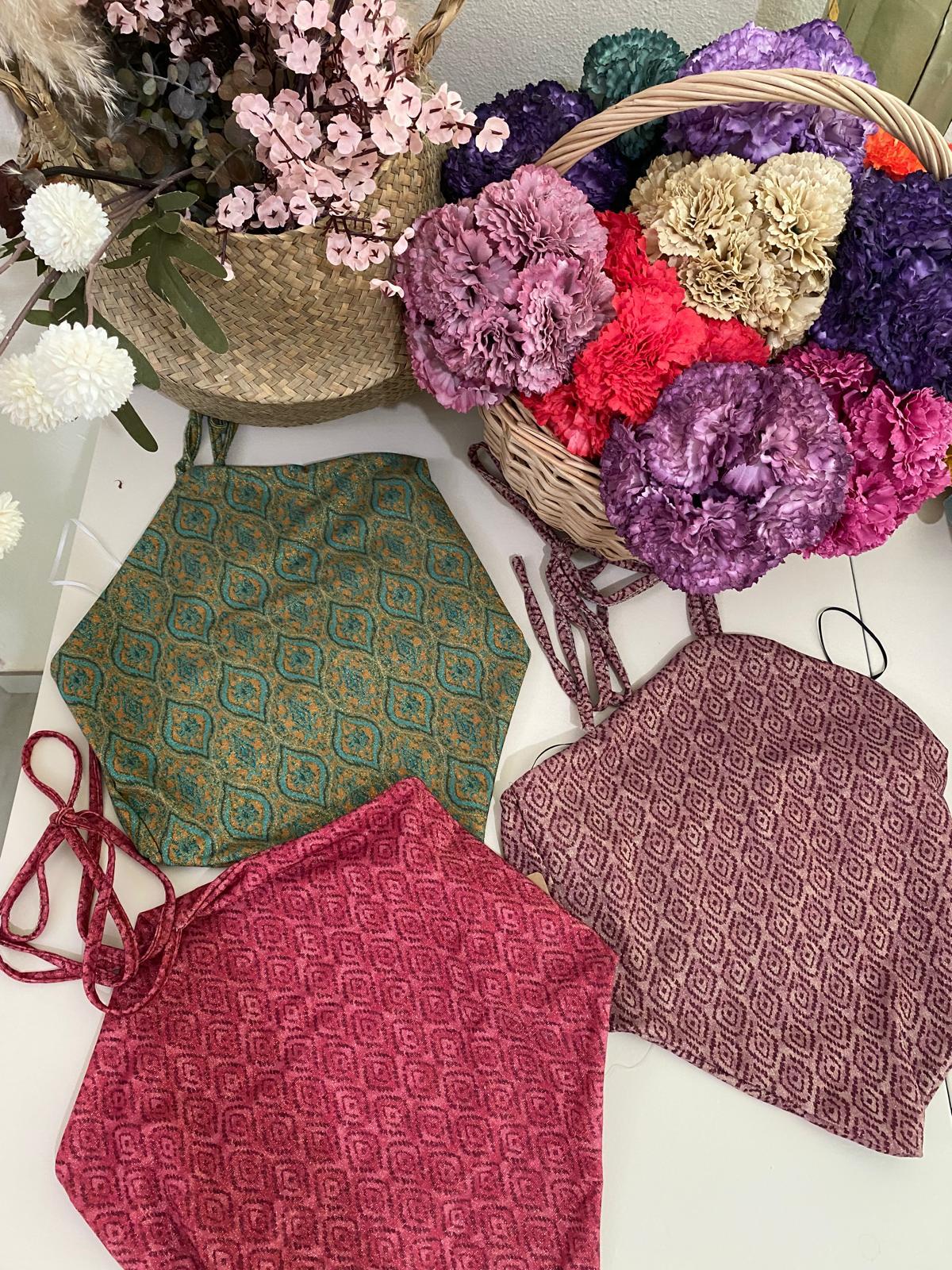 Top atado al cuello de tejido elástico. en color verde hierba, rosa fucsia y burdeos. Talla única.