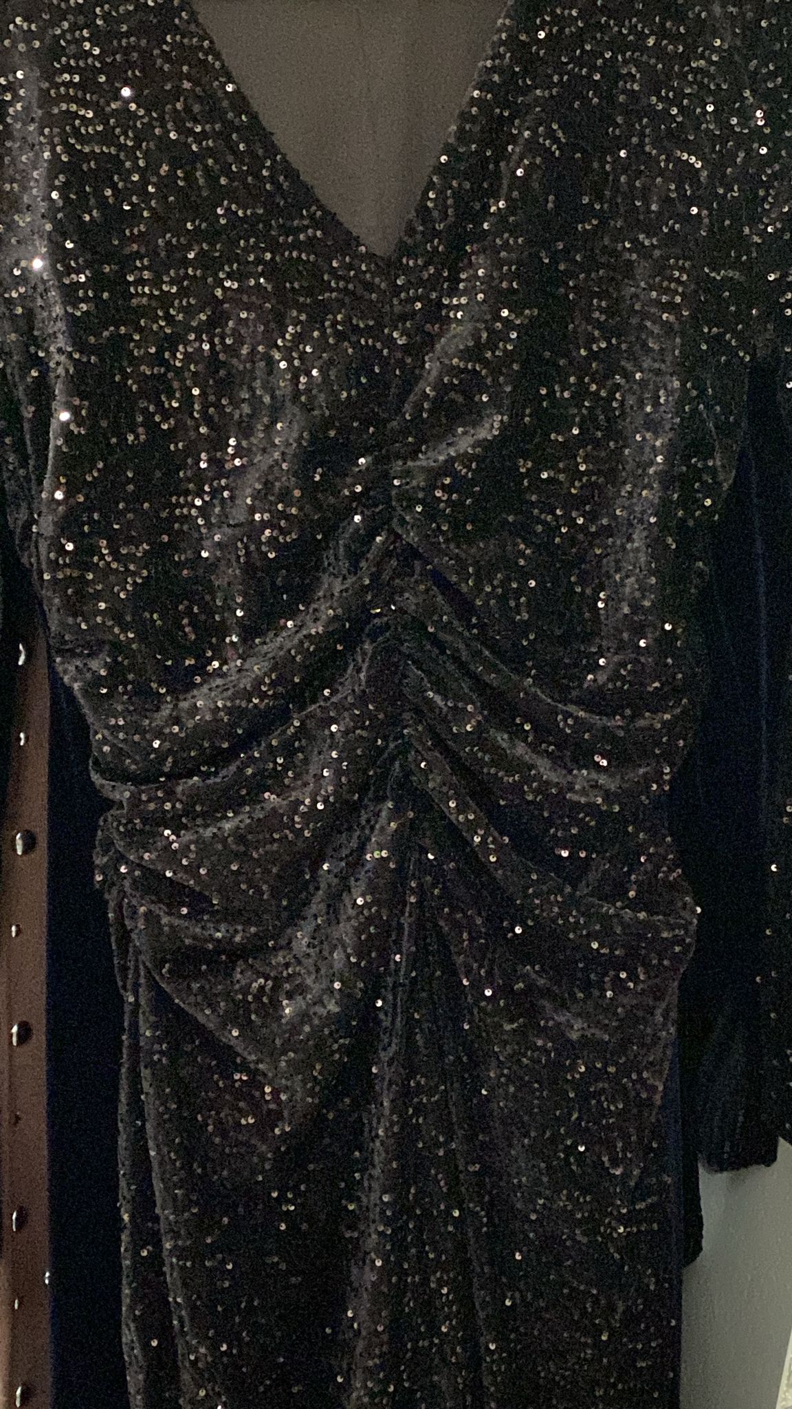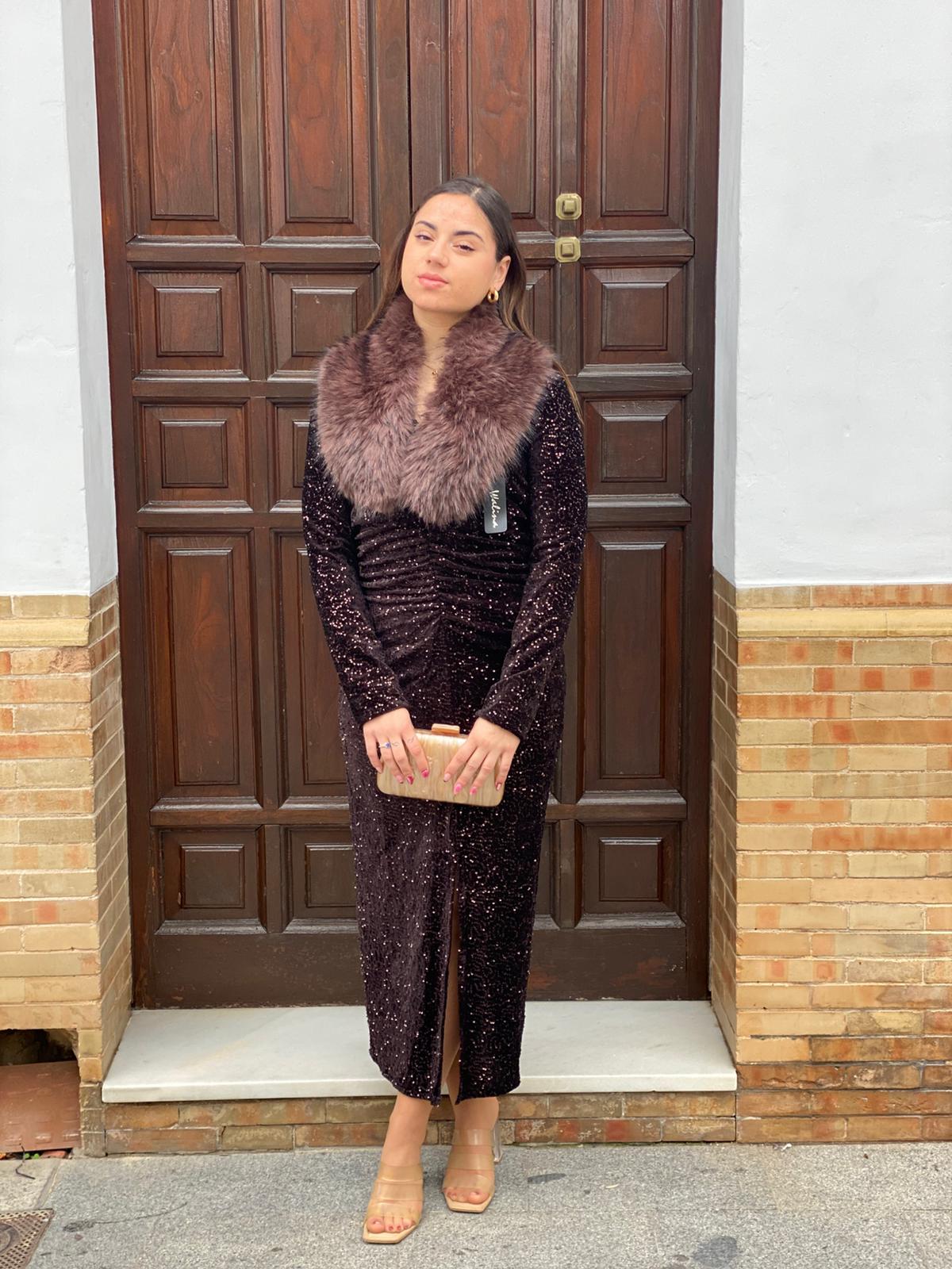 Vestido de terciopelo con lentejuelas en color marrón. De escote en V y drapeado bajo escote y en la espalda. De talla única.