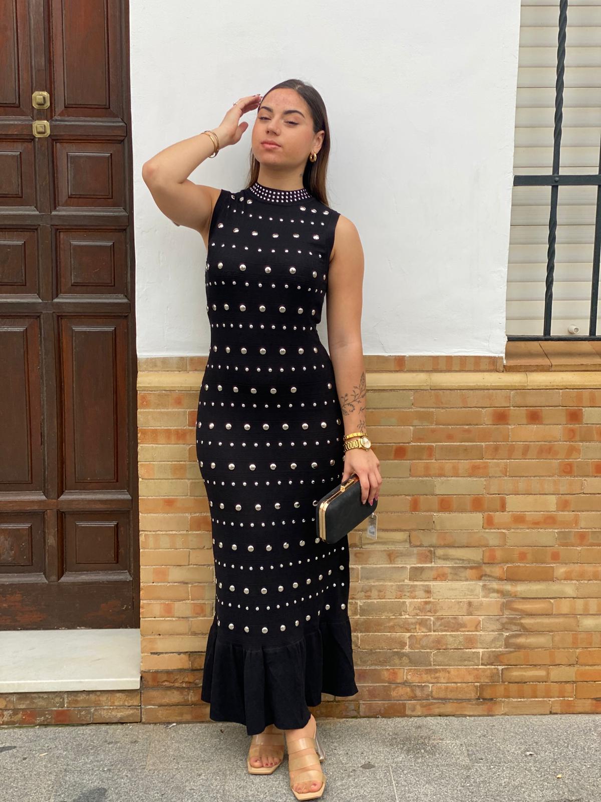 Vestido con tachuelas en color plata. De tejido elástico y talla única.
